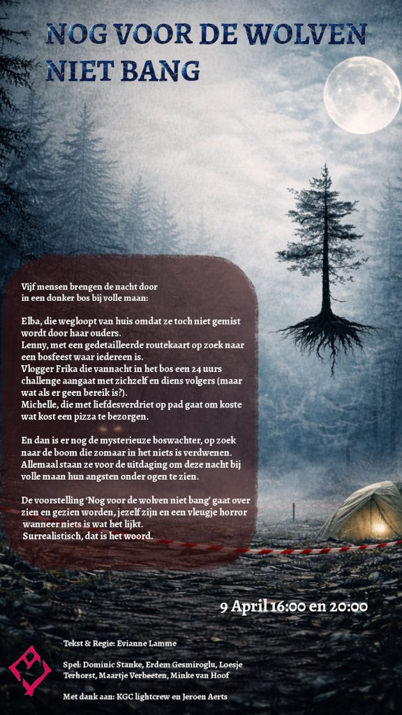 De voorstelling ‘Nog voor de wolven niet bang’ gaat over zien en gezien worden, jezelf zijn en een vleugje horror wanneer niets is wat het lijkt. Surrealistisch, dat is het woord.